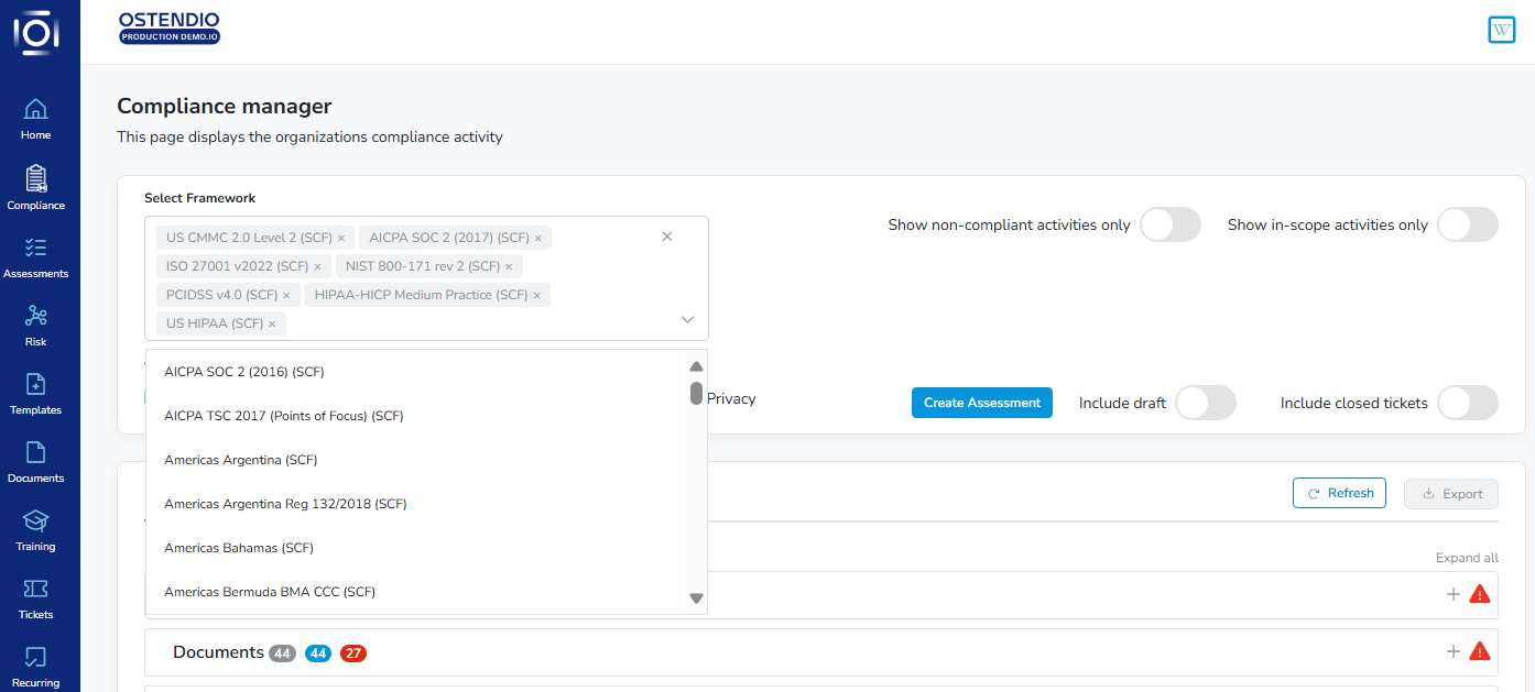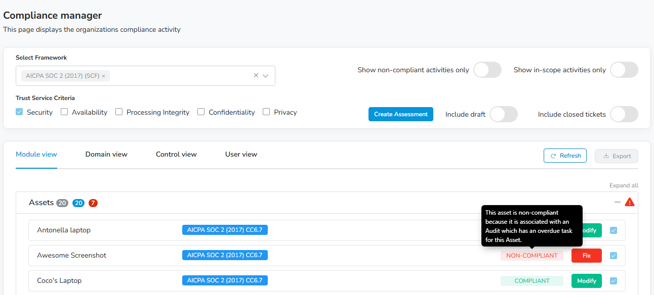 Show all non-compliant activities only and show activities in-scope for your framework to help pinpoint non-compliance. Changes affect all sections within each view.