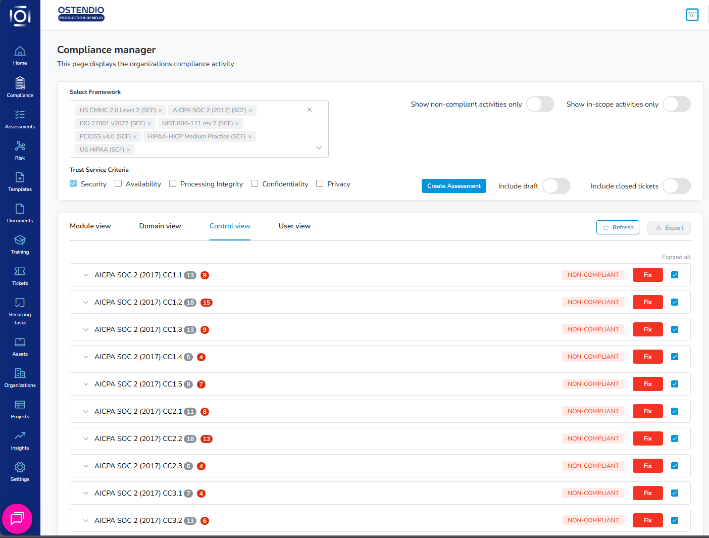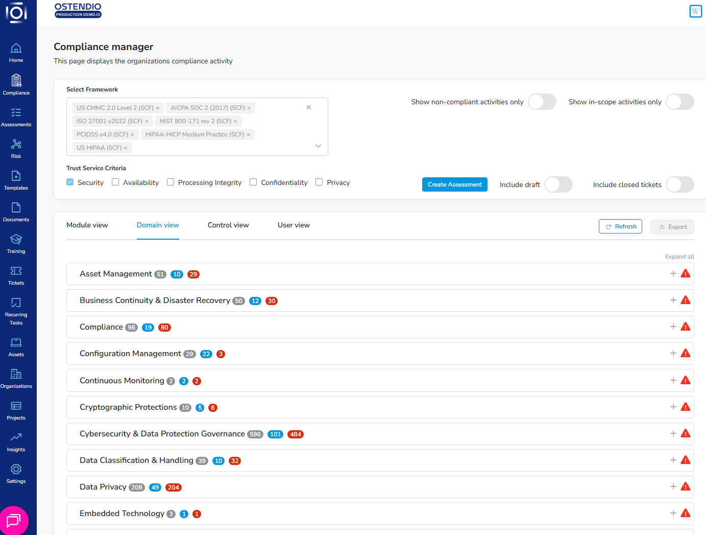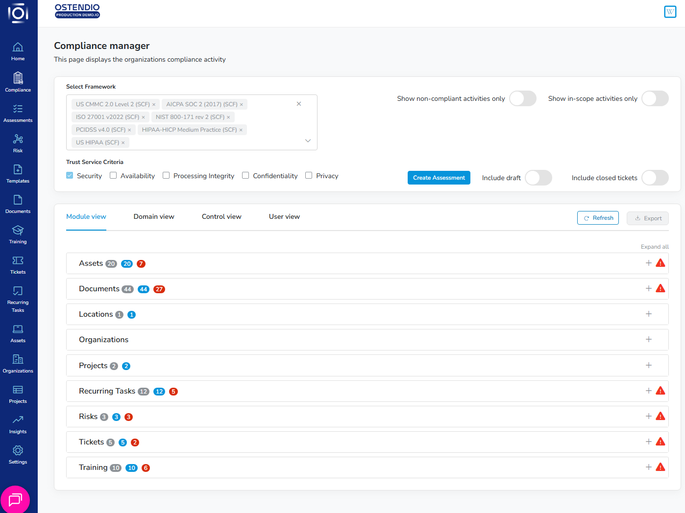 Start off by selecting a framework, you can select up to five. You can manage each framework in four different views: Module view, Domain view, Control view and User view. Supported frameworks such as AICPA, will display the Trust Service Criteria selection via checkboxes.