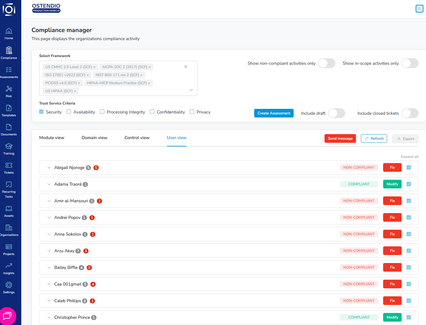 The fix path brought the user from asking, “What assets in my SOC 2 are non-compliant?” to send a message to all non-compliant task owners for an asset in less than six clicks. Previously, a user would need to check each asset for compliance after verifying its relation to the framework and scope.