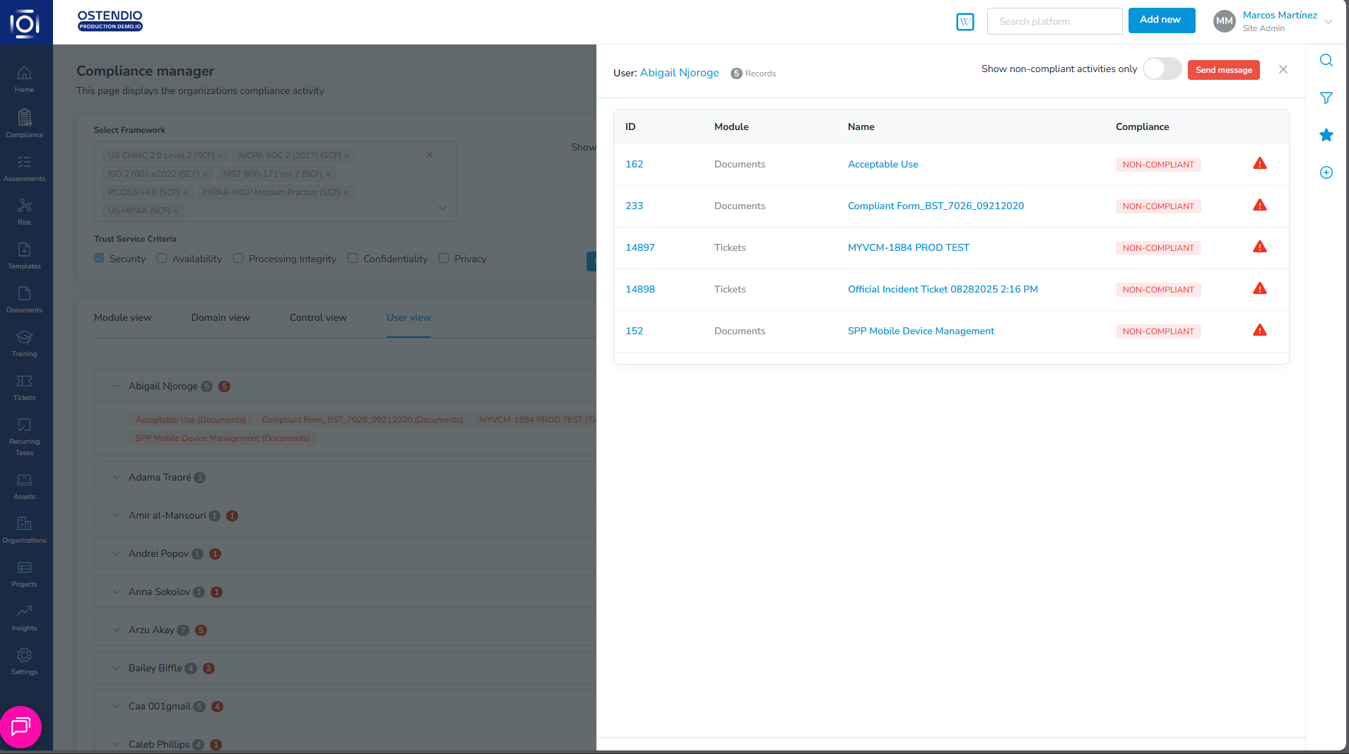 The User view will show the artifacts associated specifically to that user, help identify those who are contributing to non-compliance against a particular framework, and initiate a fix path to manage compliance.