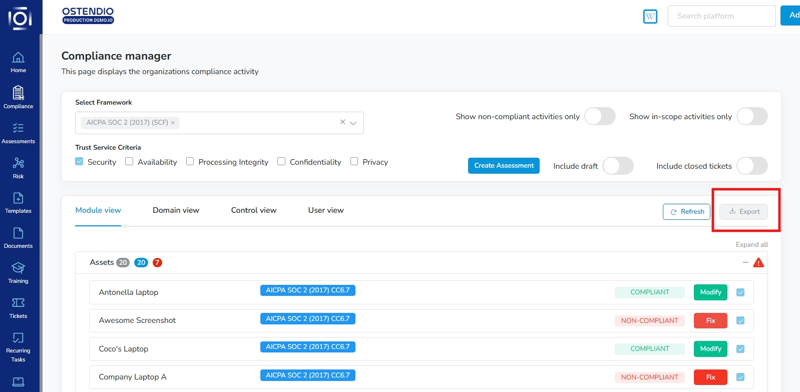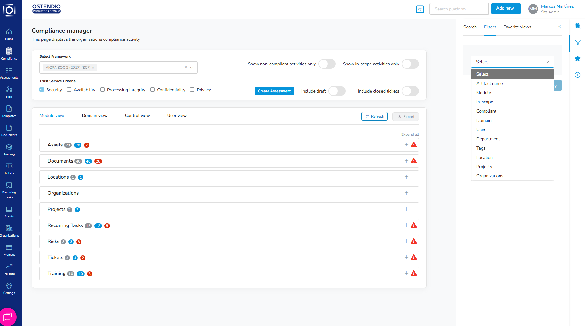 The side tray filters include, Artifact name, Module, In-Scope, Compliant, Domain, User, Department, Control and Location.